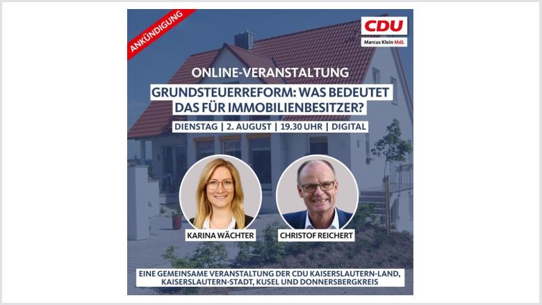 Die Kreisvorsitzenden Marcus Klein MdL (KL-Land), Andrea Schmitt (Donnersberg), Michael Littig (KL-Stadt) und Sebastian Borger (Kusel) laden Sie sehr herzlich zur nachfolgenden Onlineveranstaltung mit Fachleuten der CDU-Landtagsfraktion ein für: Dienstag, den 02. August 2022 um 19:30 Uhr. Die Veranstaltung findet online statt.